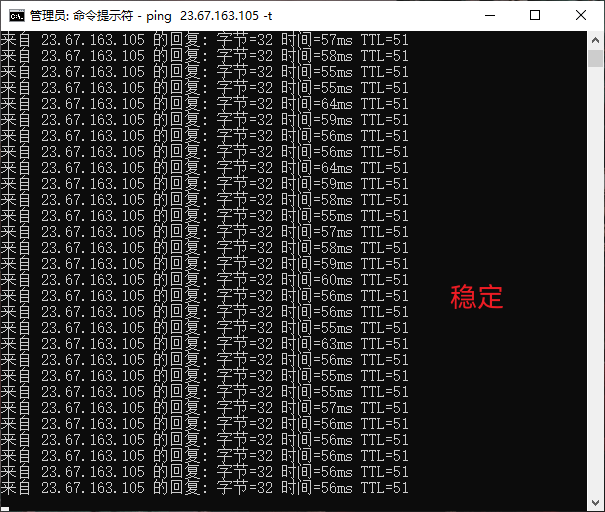 拿到IP后, 使用 CMD 测试稳定性. 命令: ping [IP] -t